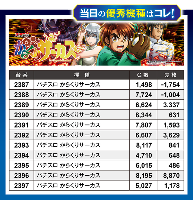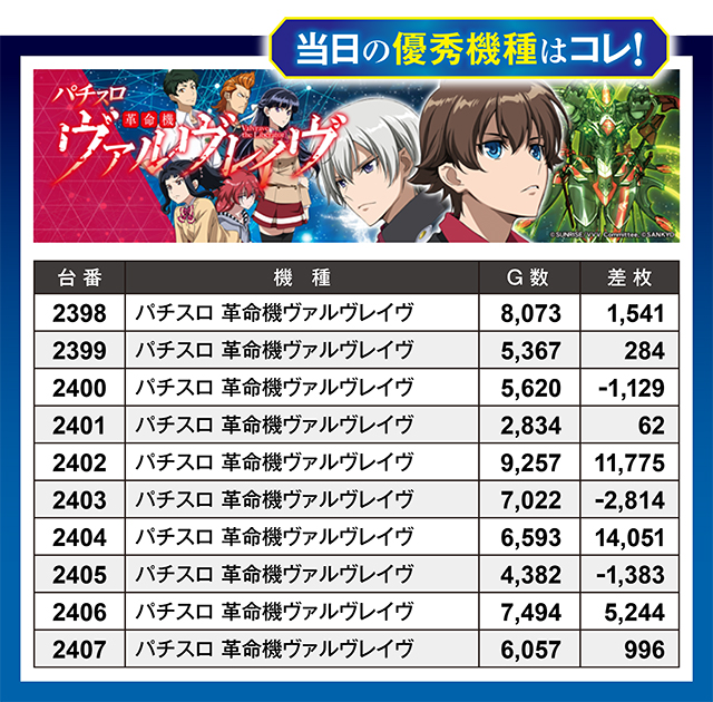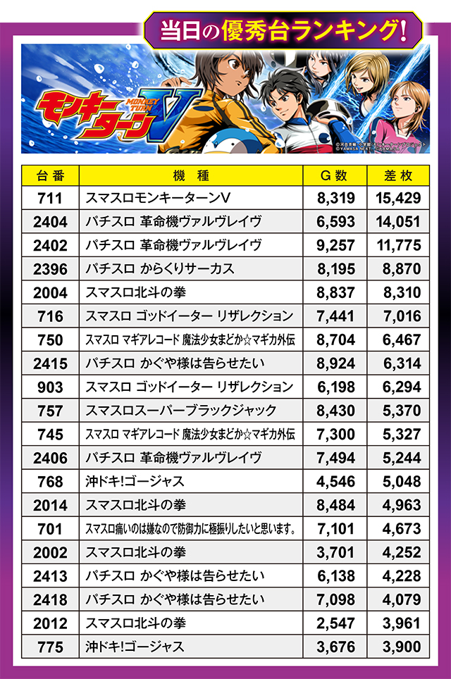 前回、大活躍を見せた『スマスロモンキーターンV』が、最高差枚レコードに!さらに『パチスロ 革命機ヴァルヴレイヴ』や『パチスロ からくりサーカス』などといった当代きっての人気&ハイスペック機が期待以上の結果を残してくれた。次回もこれらの機種に注視した方がいい…?