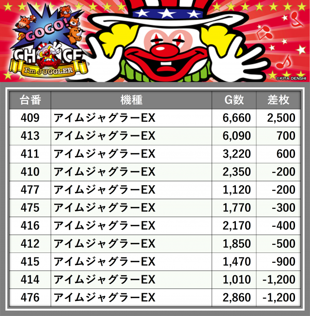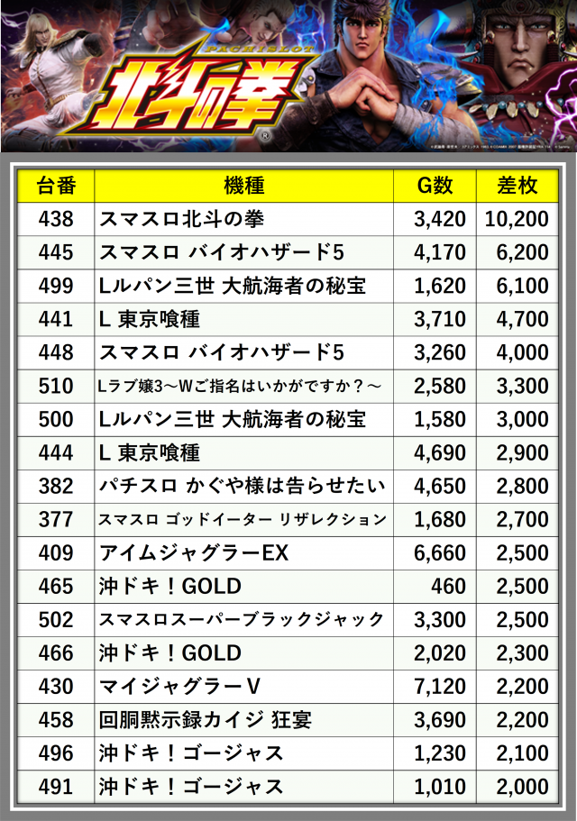厳選された取材対象機種をはじめ、その他スロット全体から好記録が飛び出した!プレイヤーが楽しんだ1日を下記データにて振り返ってみて欲しい。