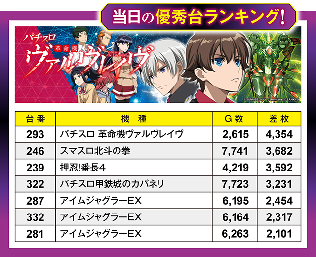 残念ながらこの日は、5,000枚超えレコードには出会えず。最高差枚となった『パチスロ 革命機ヴァルヴレイヴ』でも4,354枚だった。20スロ94台という規模では、兄弟店のように複数の10,000枚超えレコードは難しい…。