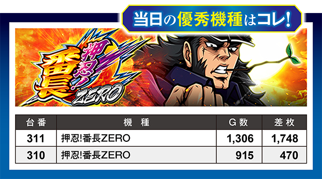 2台設置の『押忍!番長ZERO』は2台ともがプラス!なぜか2台ともにガッツリとは回されなかったようで、プラス差枚も大きな数値にはならなかった。もっと回されていたら…!