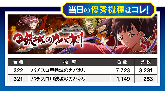 同じく2台設置の『パチスロ甲鉄城のカバネリ』も全台プラスを達成!あまり回されなかった321番台は微プラスで終わったが、7,000G以上回された322番台は3,000枚超え!