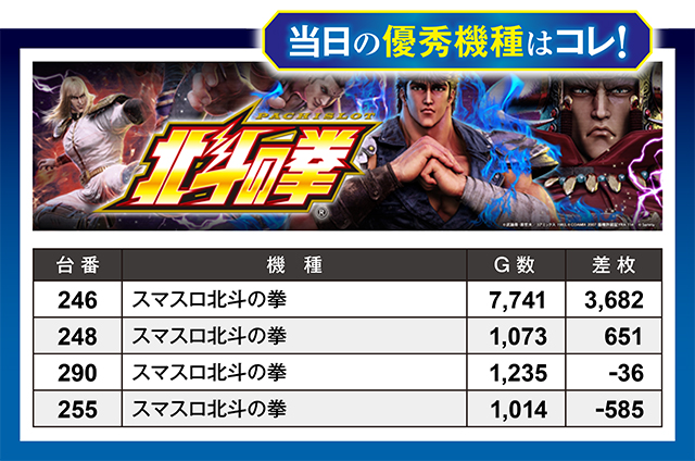 20スロ総台数94台、ほとんどの機種が1台設置という状況の中で、2台設置の『押忍!番長ZERO』『パチスロ甲鉄城のカバネリ』、4台設置の『スマスロ北斗の拳』から好結果が飛び出した。設置台数が少ないということは、それだけ立ち回りが難しいということ。それでもしっかり立ち回ることで、チャンスをモノにできるはずだ。