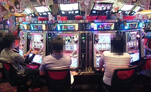 「SLOT魔法少女まどか☆マギカ」や「沖ドキ!-30」などの支持も厚く、シマ内は楽しげな雰囲気。