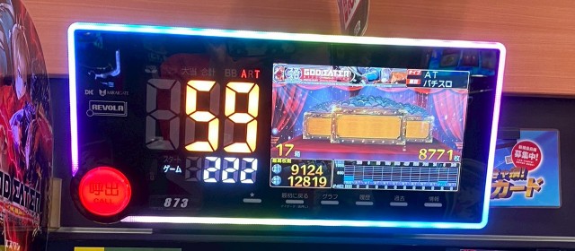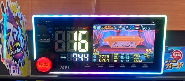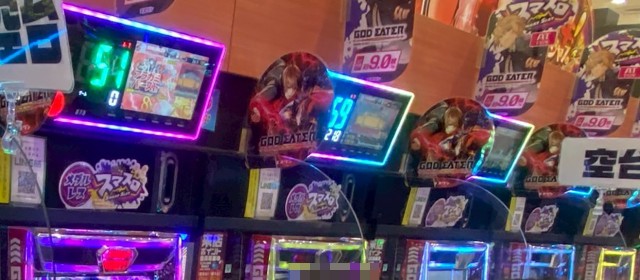 最初に向かったのが20スロのシマ。冒頭に掲載した写真の『スマスロ ゴッドイーター リザレクション』 の表示出玉9,100枚超を筆頭に、スマスロには好調台が相次いだ。