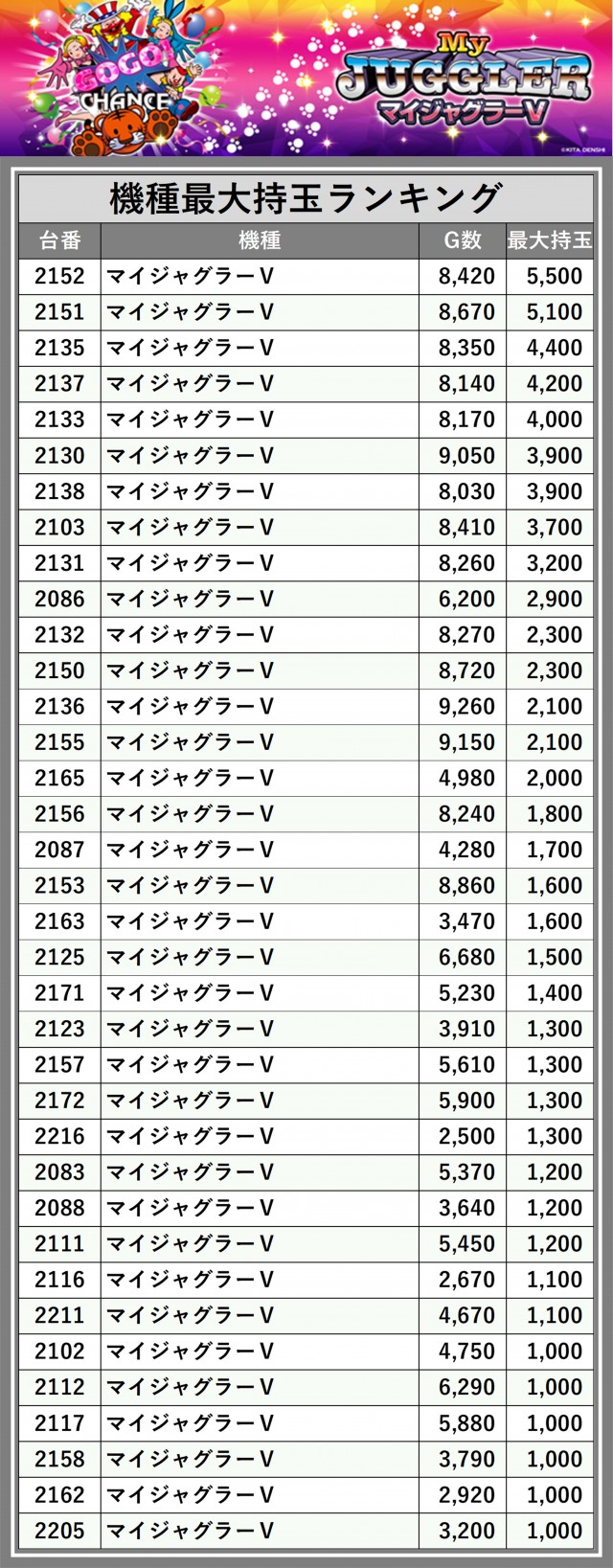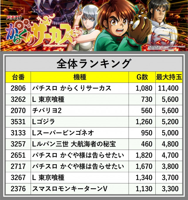 厳選された取材対象機種をはじめ、その他スロット全体から好記録が飛び出した!プレイヤーが楽しんだ1日を下記データにて振り返ってみて欲しい。