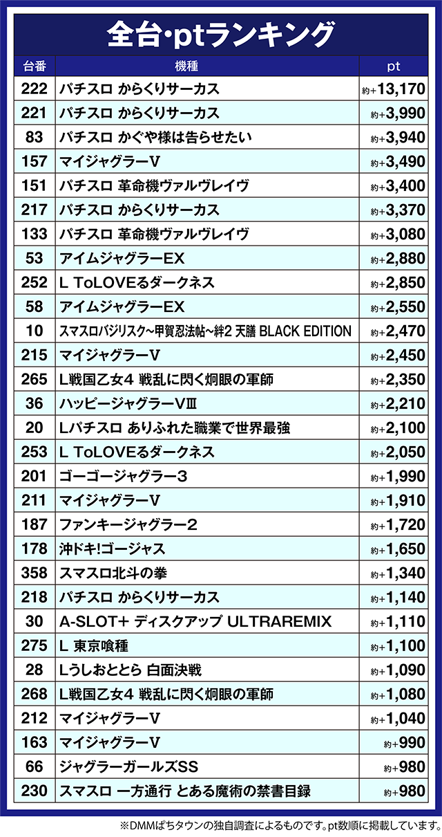 「パチスロ かぐや様は告らせたい」の83番台も約+4,000ptクラスと、多彩な機種が盛り上がりをみせた。