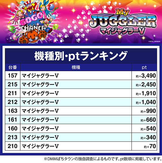 「ゴーゴージャグラー3」の201番台や「ファンキージャグラー2」の187番台も約+1,700pt以上となった。