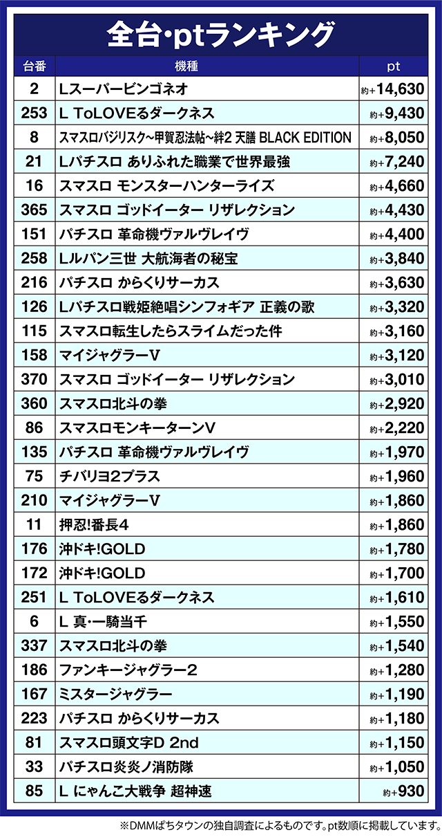 「スマスロ モンスターハンターライズ」の16番台や「スマスロ ゴッドイーター リザレクション」の365番台も約+4,000pt以上と、多くの台が結果を残した。