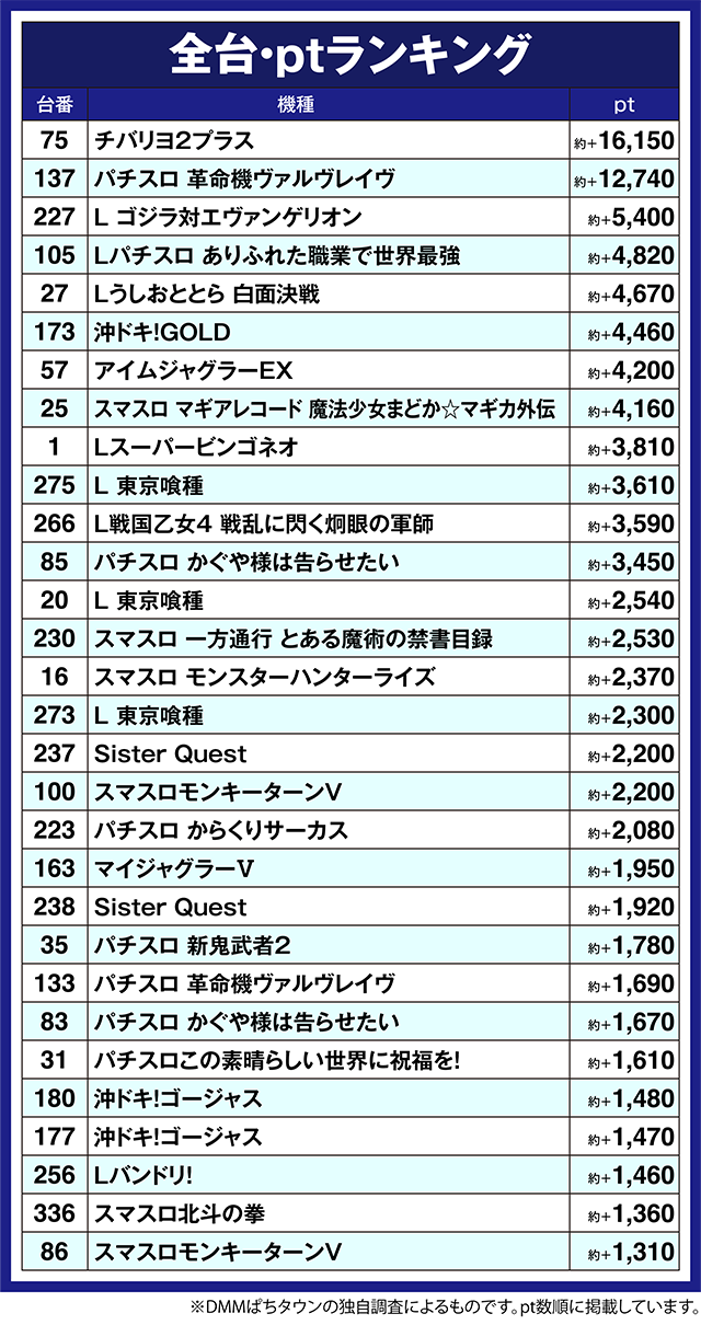 ほかにも、「Lパチスロ ありふれた職業で世界最強」の105番台や「Lうしおととら 白面決戦」の27番台なども4,400ptオーバー。