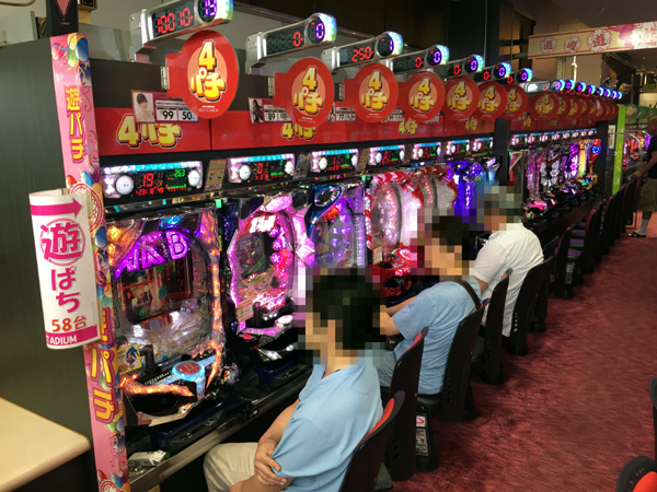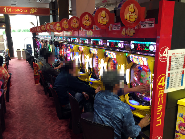 4円パチンコでは、遊パチタイプに人気が集中。「CRぱちんこAKB48 バラの儀式Sweet まゆゆVersion」や「CRAスーパー海物語IN沖縄4withアイマリン」で活躍するプレイヤーの姿が多く見られ、コーナー全体が華やかに感じられた。