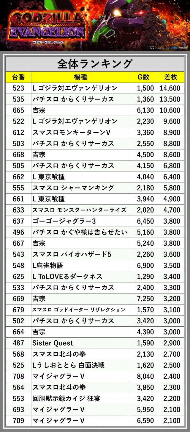厳選された取材対象機種をはじめ、その他スロット全体から好記録が飛び出した!プレイヤーが楽しんだ1日を下記データにて振り返ってみて欲しい。