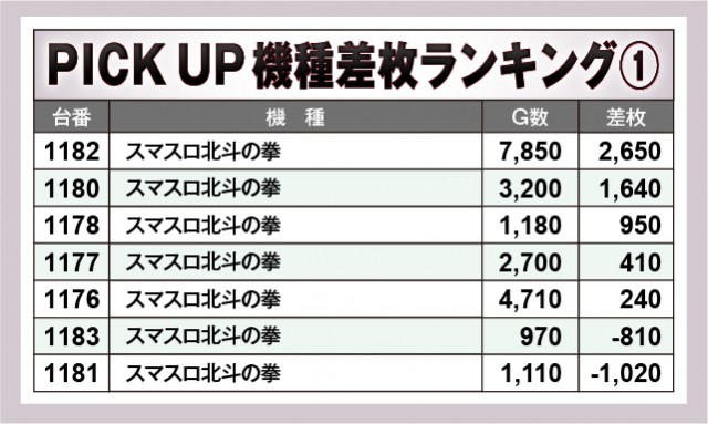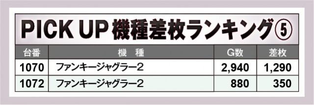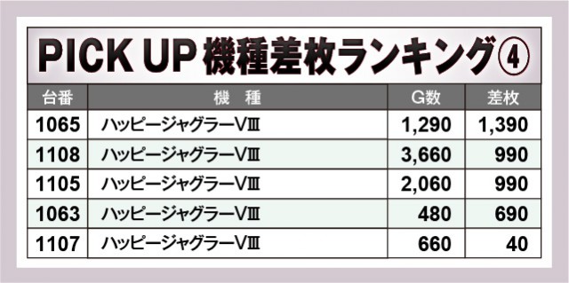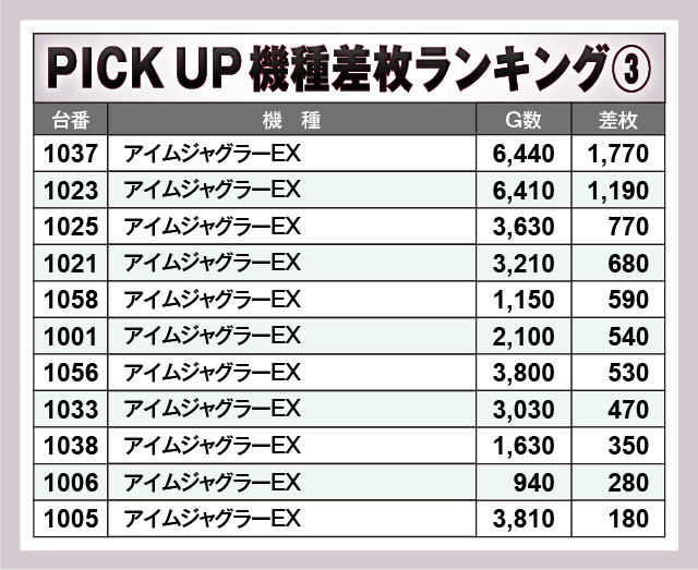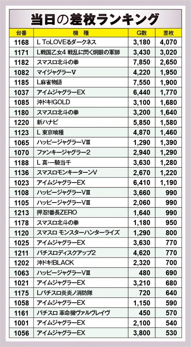 『スマスロ北斗の拳』は朝から閉店までじっくりと打ち込まれた形跡を確認でき、ファンが手応えを感じていた様子が手に取るように分かる。コンスタントに大当りを射止めており、それは『ジャグラー』シリーズも同様で、上表から読み取れるはずだ。しっかりとプラス差枚で終えた台が多くなっており、ファンにとって欠かせない存在と言えよう。