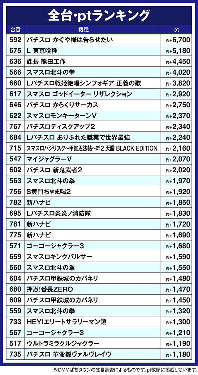 「課長 熊田工作」の636番台は約+4,450pt、「Lパチスロ戦姫絶唱シンフォギア 正義の歌」の660番台も約+3,820ptを記録。