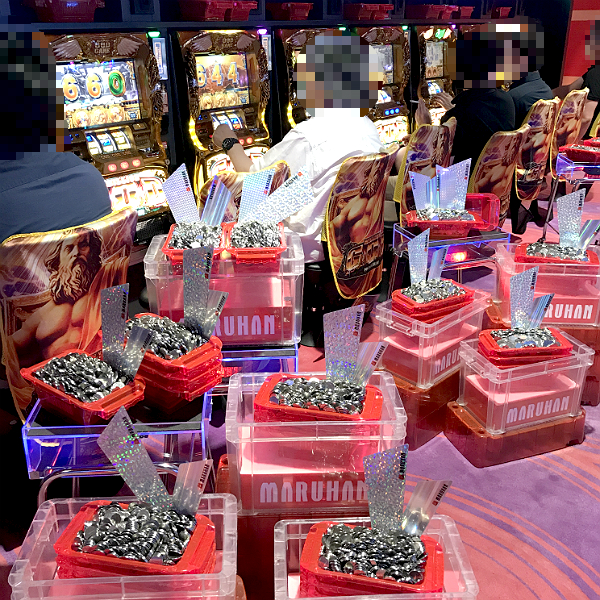 20円パチスロでは、「ミリオンゴッド-神々の凱旋-」が大きな盛り上がりをみせていた。華麗なパフォーマンスを披露する姿もみられ、シマ全体のなかでもトップクラスのきらびやかさが感じられた。