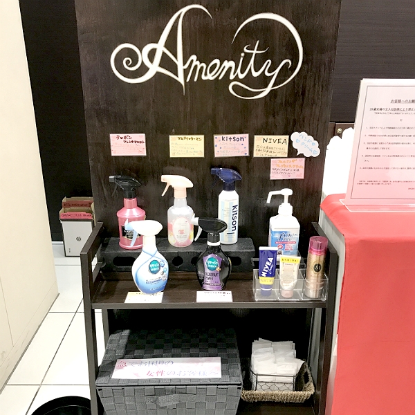 アメニティーコーナーには衣類消臭スプレーや、ヘアコロン、ハンドクリームなど、女性にとって嬉しい設備が整っていた。
