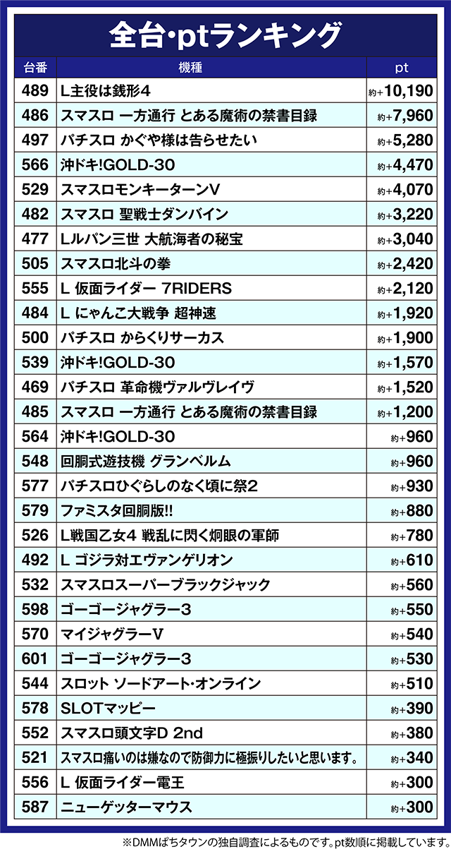 「沖ドキ!GOLD-30」の566番台や「スマスロモンキーターンV」の529番台も約+4,000ptを上回った。