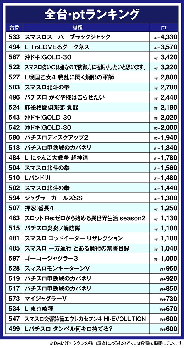 ほかにも、「パチスロ かぐや様は告らせたい」の496番台や「麻雀格闘倶楽部 覚醒」の524番台など、多くの台が約+2,000pt以上となった。