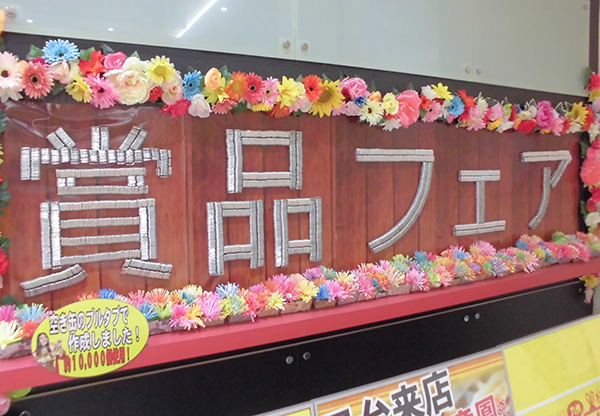 また、スイーツや珍味などが並んでいる賞品コーナーも魅力的。看板が空き缶のプルタブで作られているなど、スタッフたちのおもしろい工夫もうかがえた。