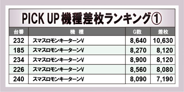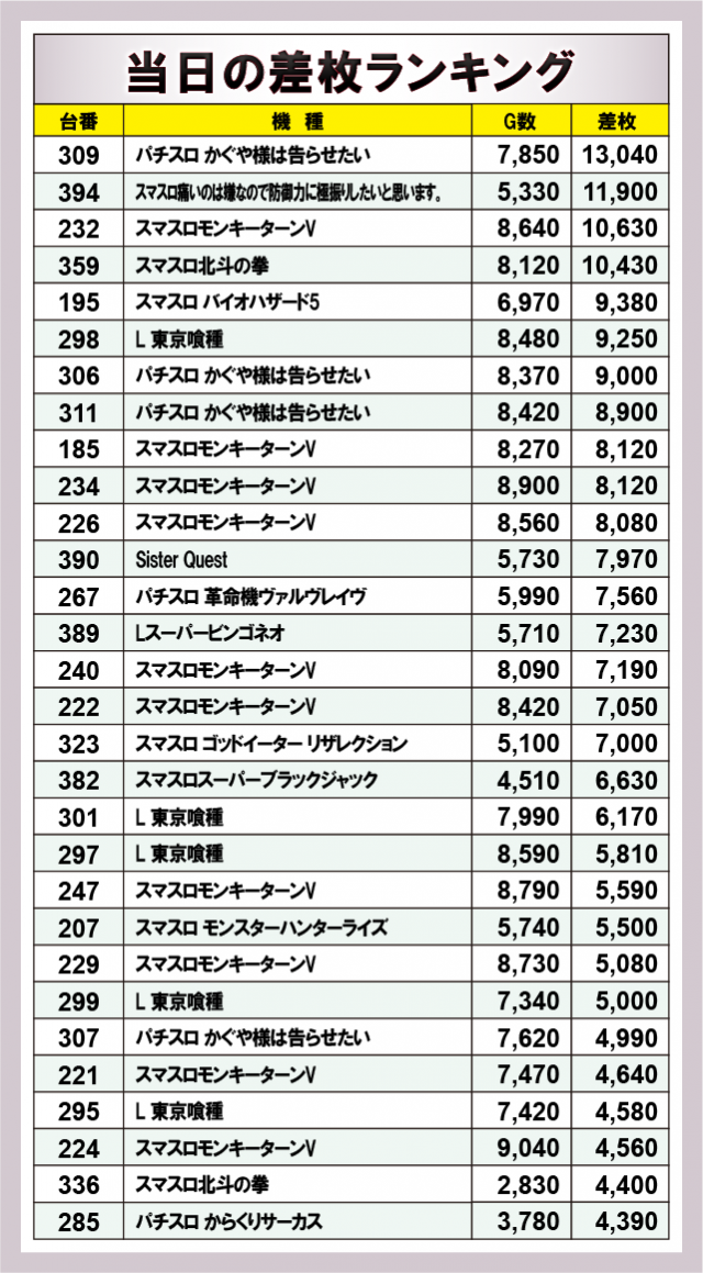 上表の優秀機種はいずれも高いポテンシャルを解き放っていたのが鮮烈であるばかり。『スマスロモンキーターンV』『パチスロ かぐや様は告らせたい』『スマスロ北斗の拳』『L 東京喰種』は万枚台や大台突破が複数うまれ、これらが当日の盛り上がりに大きく貢献。また、ノーマルタイプでは『ゴーゴージャグラー3』もコンスタントなボーナス当選を見せていた。いずれも高い回転数も見逃せないポイントで、ファンの満足度が窺えるばかりだ。