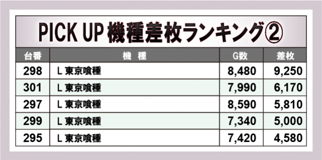 『パチスロ かぐや様は告らせたい』『スマスロ痛いのは嫌なので防御力に極振りしたいと思います。』『スマスロモンキーターンV』『スマスロ北斗の拳』で万枚OVERを記録。さらに『スマスロ バイオハザード5』『L 東京喰種』が9,000枚OVERと追随し、これらが目に見える盛り上がりが披露。また、『スマスロモンキーターンV』『L 東京喰種』が複数台ランクインするなど特定の機種の活躍が目立つのもポイントで、可能性を秘めたエリアとなっていたようだ。
