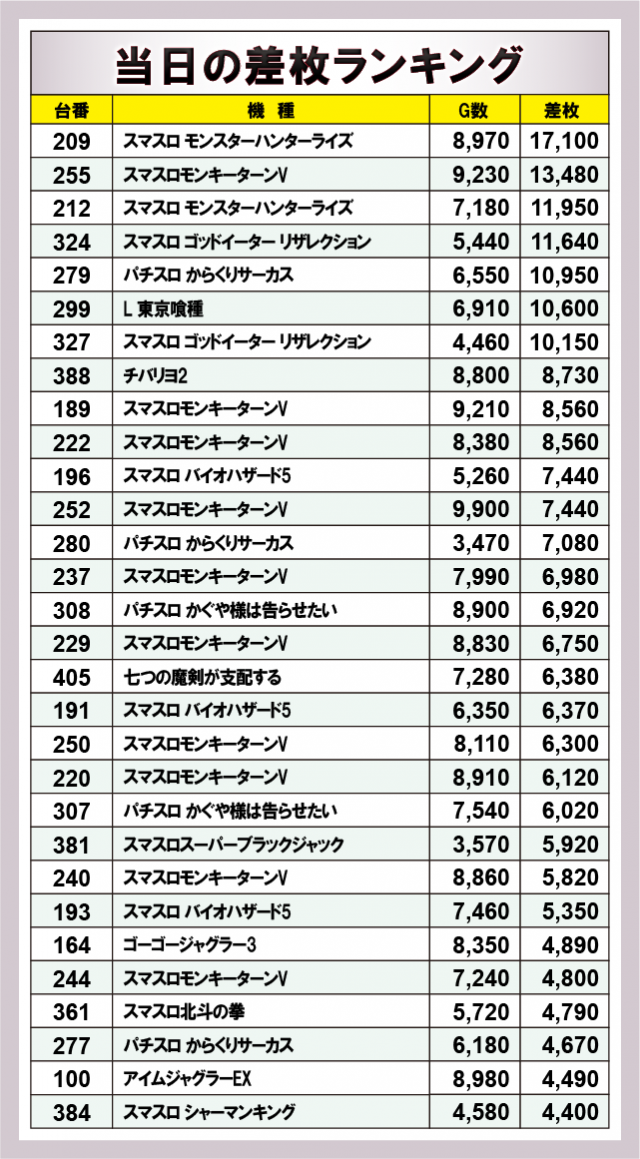 上表の5機種はいずれも活気と熱気に溢れており、当日の店内を盛り上げる存在になっていたのは間違いない。特に『スマスロモンキーターンV』『パチスロ からくりサーカス』は万枚OVER台を筆頭にまとまった出玉を獲得する台が多数発生し、島全体で凄まじい盛り上がりを披露。『スマスロ モンスターハンターライズ』『スマスロ バイオハザード5』『マイジャグラーⅤ』も同様に安定したパフォーマンスを披露しており、羨望の眼差しを向けるファンが多くいたのが鮮烈だ。