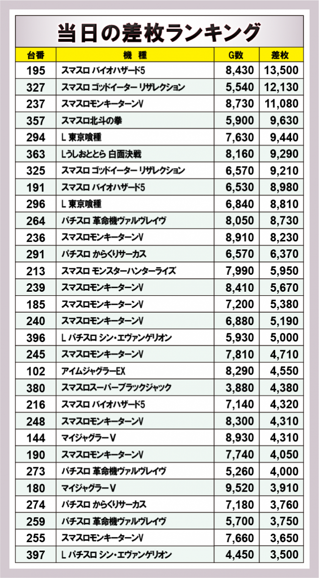 『スマスロ バイオハザード5』『スマスロ ゴッドイーター リザレクション』『スマスロモンキーターンV』から万枚OVERが飛び出し、当日の館内の盛り上がりをリード。さらに『スマスロ北斗の拳』『L 東京喰種』『Lうしおととら 白面決戦』などスマスロ定番機種から新台まで各所で大きな熱気を確認できる。また、終日を通して打ち込まれた形跡も見られ、ファンは有意義な時間を過ごしていたに違いない。