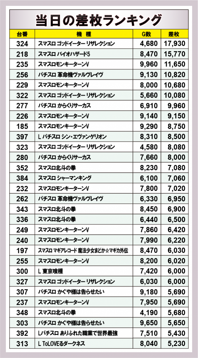 『スマスロ ゴッドイーター リザレクション』『スマスロ バイオハザード5』『スマスロモンキーターンV』『パチスロ 革命機ヴァルヴレイヴ』から計6台の万枚OVERが発生し、その後ろには『パチスロ からくりサーカス』『L パチスロ シン・エヴァンゲリオン』などが続き、スマスロ機を中心に大きな熱気を確認できる。トップ30台は5,000枚OVERからとなっている点も見逃せないだろう。また回転数に着目しても終日を通して打ち込まれた形跡が顕著で、相当な手応えを感じていたのが手に取るようにわかる。