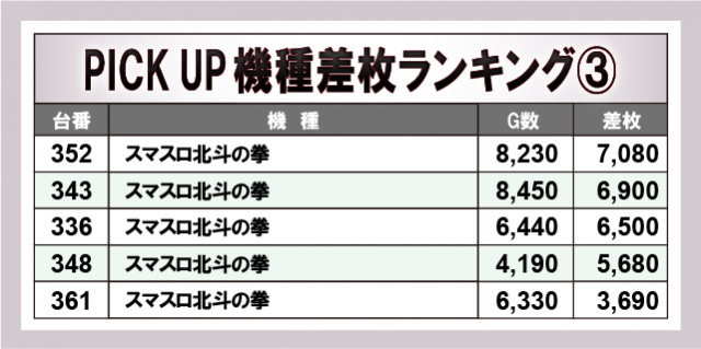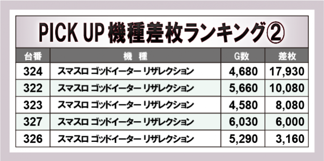 『スマスロモンキーターンV』『スマスロ ゴッドイーター リザレクション』の各2台ずつの万枚OVERが何よりも鮮烈で、さらに8~9,000枚OVERと追随する熱気もインパクト抜群だ。『スマスロ北斗の拳』も同様に気を吐き、優秀機種から熱気が形成されていたと言って過言ではない。また『マイジャグラーⅤ』『ゴーゴージャグラー3』も3~4,000枚OVER、じっくりと打ち込まれた形跡も相まって、ファンが笑顔になれるエリアとなっていたようだ。