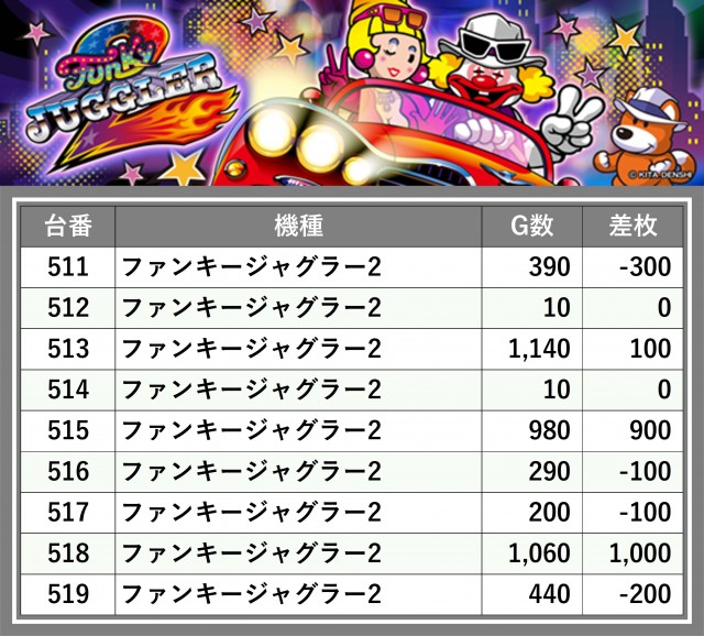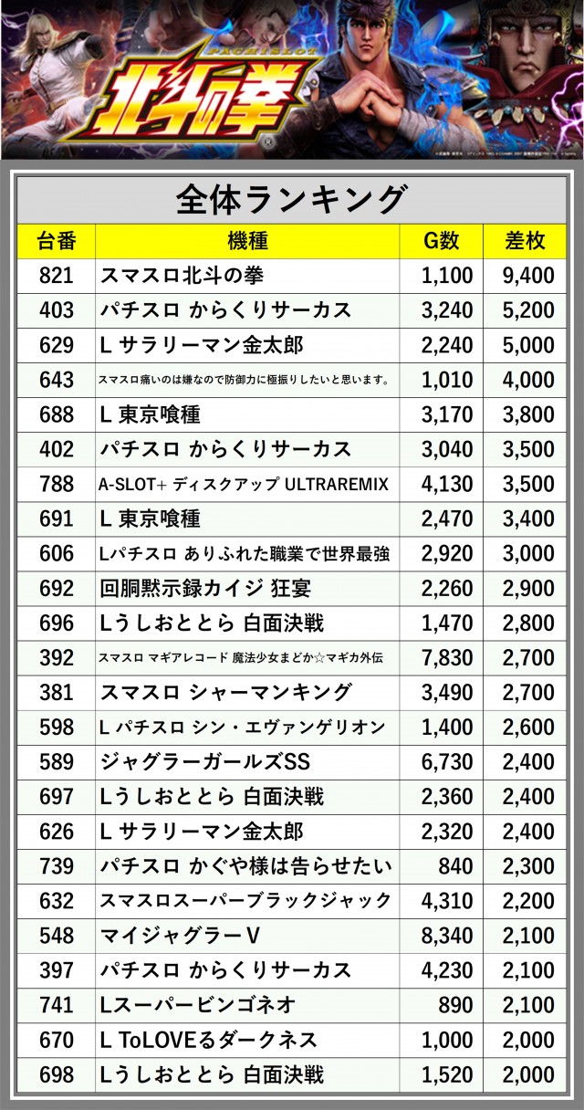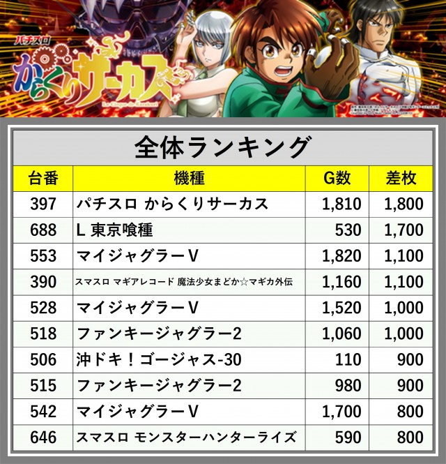 厳選された取材対象機種をはじめ、その他スロット全体から好記録が飛び出した!プレイヤーが楽しんだ1日を下記データにて振り返ってみて欲しい。