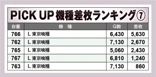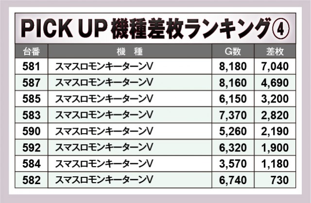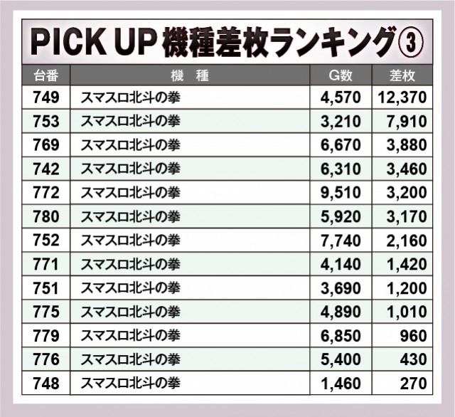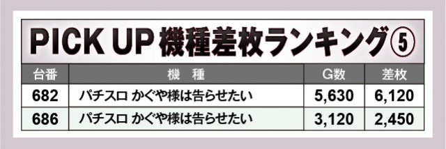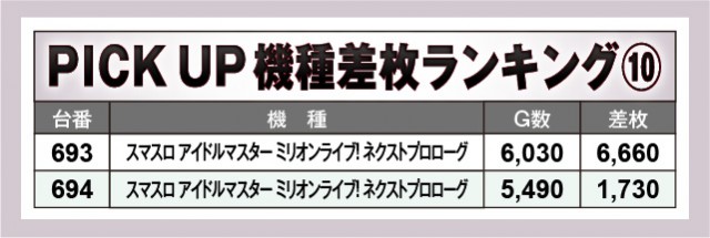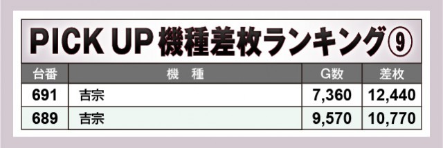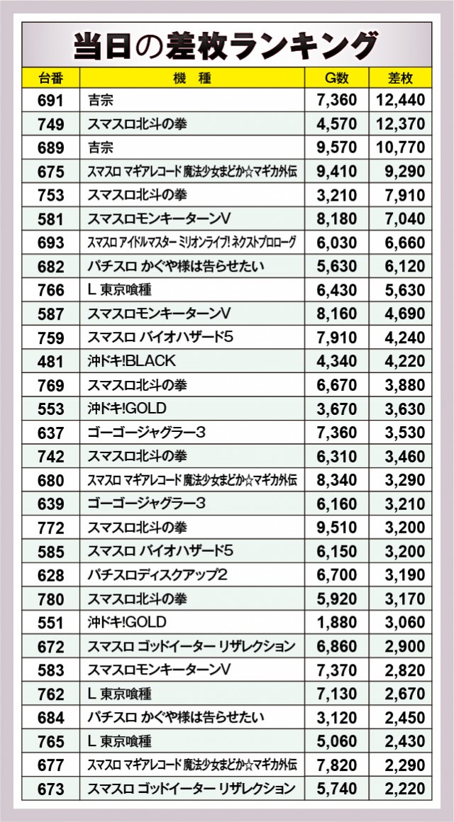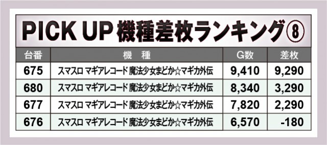 『吉宗』『スマスロ北斗の拳』から合計3台の万枚OVERが飛び出し、その内の前者から2台の万枚台が生まれるなど、凄まじい熱気を放っていた。そして『スマスロ マギアレコード 魔法少女まどか☆マギカ外伝』も9,000枚OVERで続いており、大台突破台の多さも相まって、館内の盛り上がりは大きかったと言える。もちろん回転数を見ても終日を通して打ち込まれており、ファンが嬉々としてレバーを叩いていたに違いない。