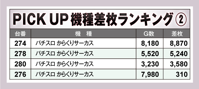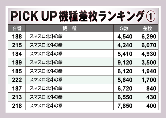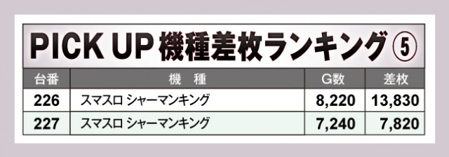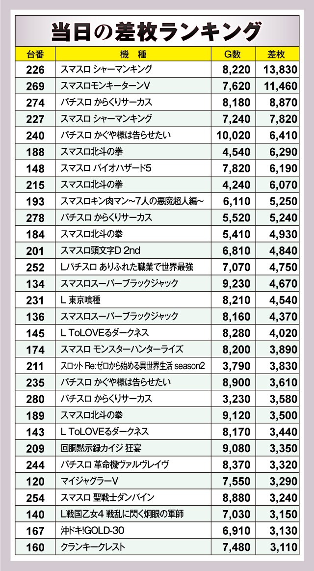 まずは当日の差枚ランキングを紹介していこう。なんと30台すべてが差枚+3,000枚を超えており、+5,000枚オーバーは10台出現。さらに大台突破の+10,000枚オーバーは2台と大盛り上がり! それらのなかでもっとも優秀だった台は、226番台の「スマスロ シャーマンキング」で、差枚は+13,830枚を獲得! その他ランクイン機種を見渡すと、さまざまな機種がランクインするなか、人気機種の「スマスロ北斗の拳」や「パチスロ からくりサーカス」など、特定の機種が複数ランクイン。人気機種を筆頭に楽しめる環境が整っていたようだ!