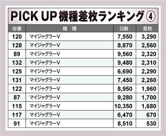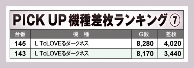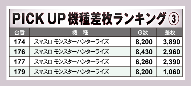 続いては、当日店内を大いに盛り上げた7機種をチェック。7機種全てから良台が出現していたが、とくに注目して欲しいのは「スマスロ モンスターハンターライズ」の盛り上がり。ピックアップ4台すべてが差枚+1,000枚超えと上々の結果をマーク! その他の機種も素晴らしく、もちろんこれら7機種以外からも良台はアチコチに出現していた!