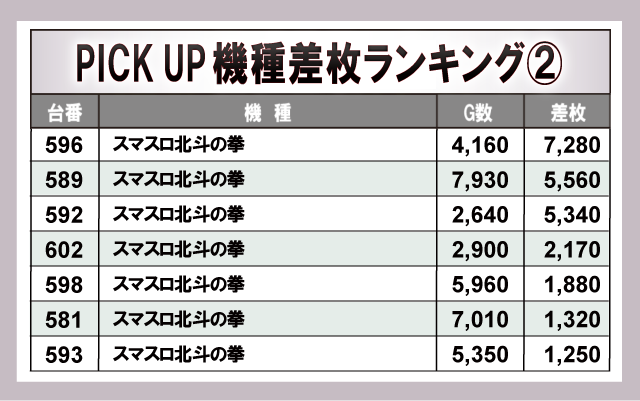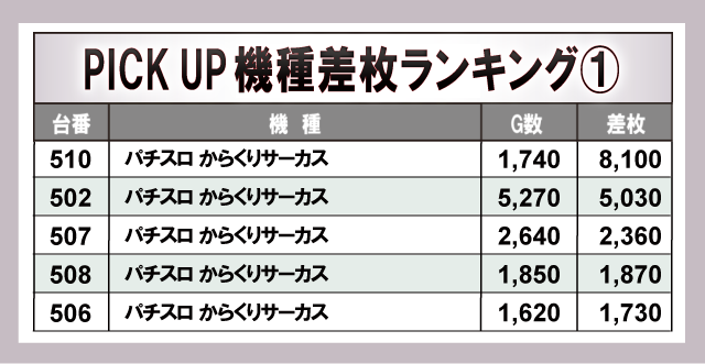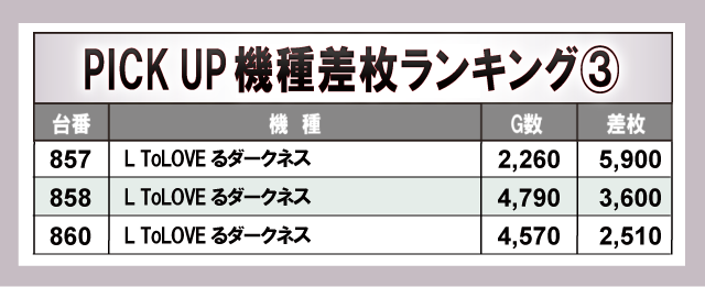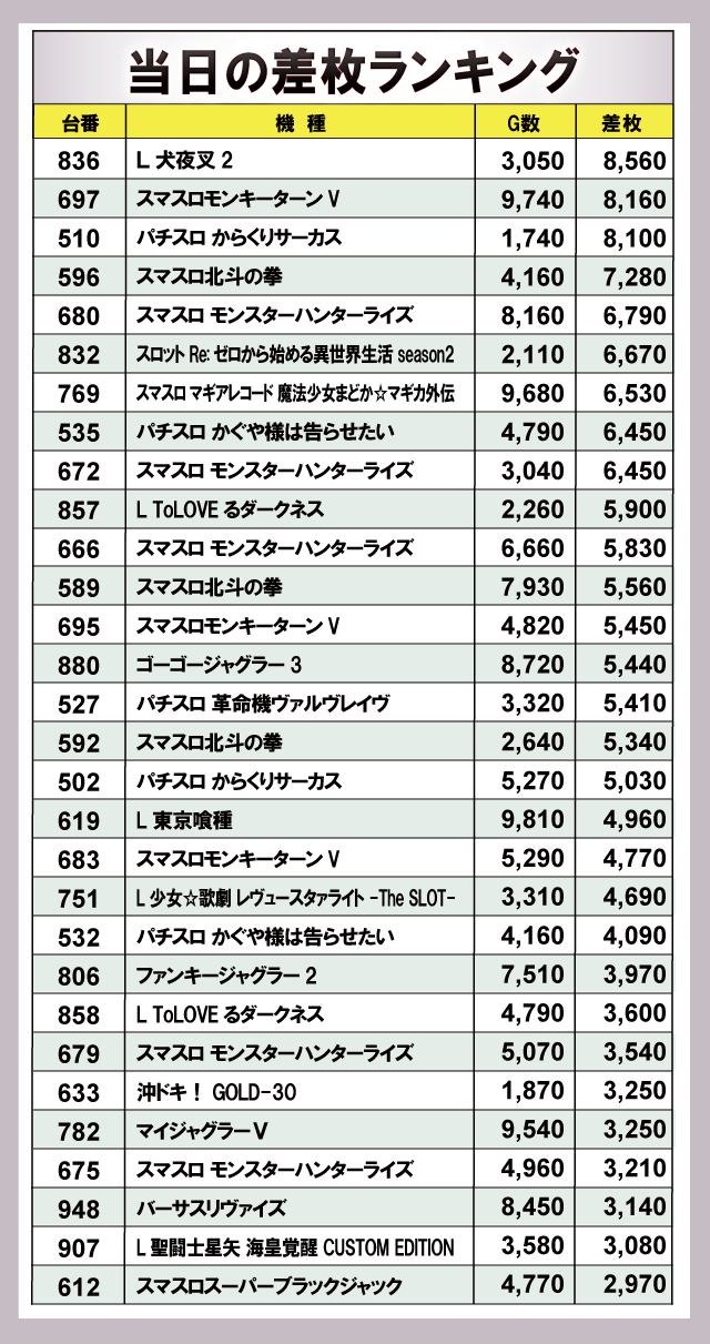 まずは差枚ランキングのチェックから。30台すべてが+2,000枚オーバーのプラスをマークし、+5,000枚オーバーは17台出現! それらのなかでもっとも優秀だったのは、836番台の「L 犬夜叉2」で差枚は+8,560枚を獲得! 差枚ランキングにはその他にも幅広い機種が名を連ねており、店内のどこからでもチャンスがあったことが窺える。