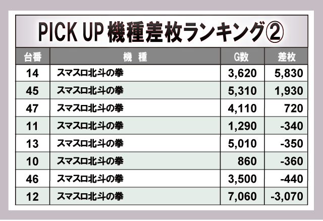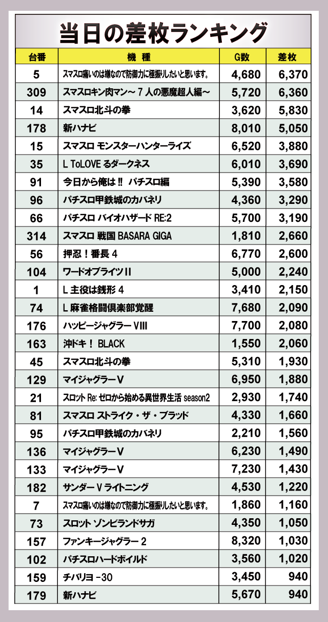 まずは当日の差枚ランキングを紹介していこう。30台のうち16台が差枚+2,000枚オーバーで、+3,000枚オーバーは9台出現。それらのなかでもっとも優秀だった台は、5番台の「スマスロ痛いのは嫌なので防御力に極振りしたいと思います。」で、差枚は+6,370枚を獲得!次いで、『スマスロキン肉マン~7人の悪魔超人編~』から+6,360枚を獲得!その他ランクイン機種を見渡すと、人気スマスロ機からメダル機まで様々な機種が盛り上がりを披露している様子が窺えた。