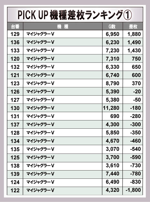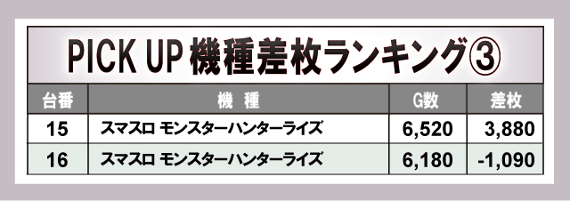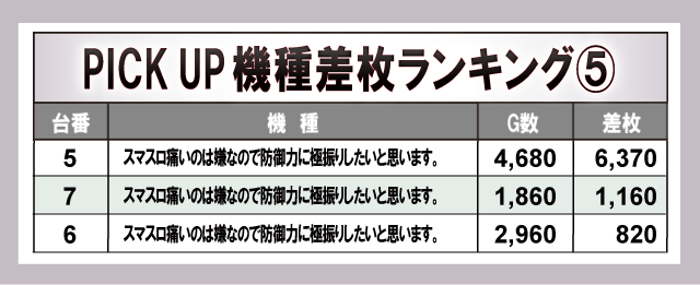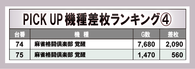 続いては、当日店内を大いに盛り上げた6機種をチェック。『麻雀格闘倶楽部 覚醒』『スマスロ痛いのは嫌なので防御力に極振りしたいと思います。』は全台プラス差枚で終了しており、打ちごたえのある状況が整っていたことが窺える。また、これら5機種以外からも良台はアチコチに出現していた!