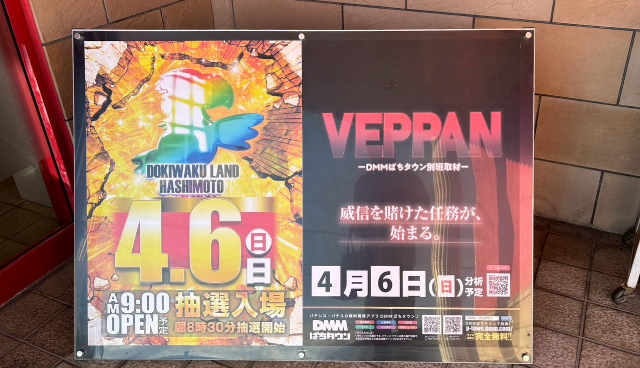 DMMぱちタウン取材班〝別班〟が威信を賭けて執り行う「VEPPAN」が、4月6日に「ドキわくランド橋本店」にて実施された。当日は朝から62人ファンが集まった。取材時は店内各所で活気に溢れており、多数の好調箇所が見受けられた。果たしてどんな展開が繰り広げられていたのか、ここからはスロット全226台の詳細とともに、当日の店内の盛り上がりをチェックしていこう!