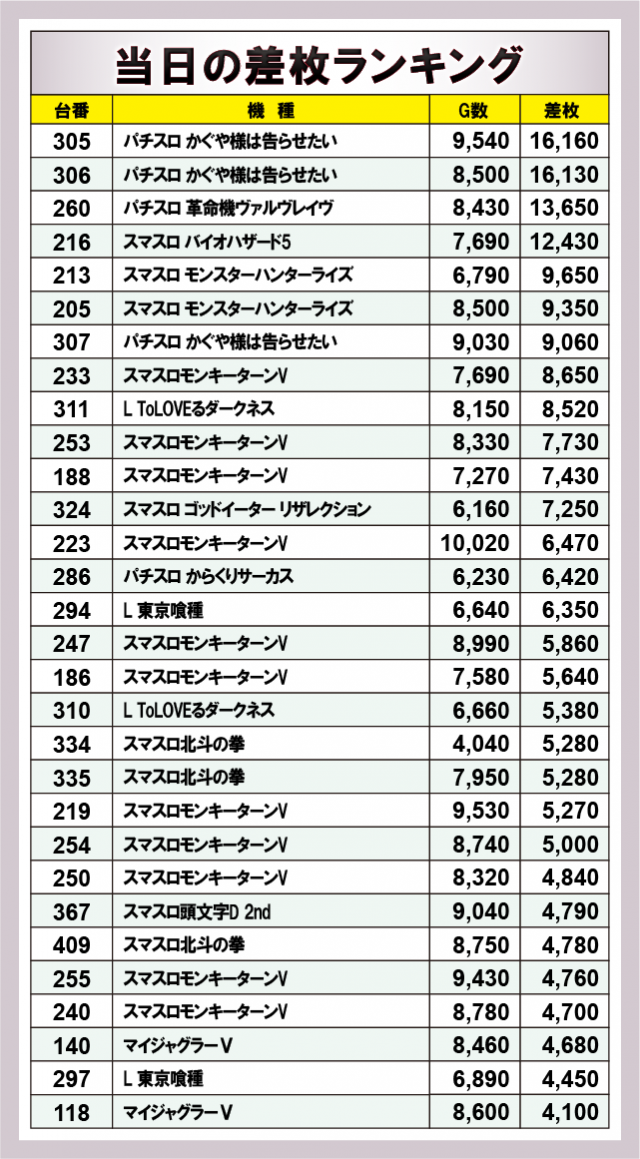 『パチスロ かぐや様は告らせたい』『パチスロ 革命機ヴァルヴレイヴ』『スマスロ バイオハザード5』から計4台の万枚OVERが飛び出しており、その後続には8~9,000枚OVERを達成する台も見られる。さらに言えば、上表は4,000枚OVERから名を連ねており、店内は凄まじい熱気に包まれていたのが一目瞭然だ。
