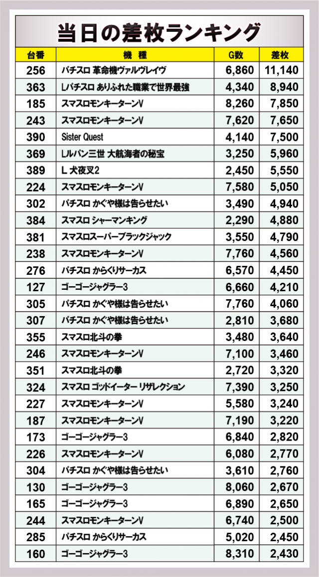 今回、活躍の中心となったのは上記の5機種。スマスロ機を筆頭に盛り上がりを見せていたが、『ゴーゴージャグラー3』『アイムジャグラーEX』といったノーマルタイプからも優秀台が出ており、店内各所でチャンスが潜んでいた!