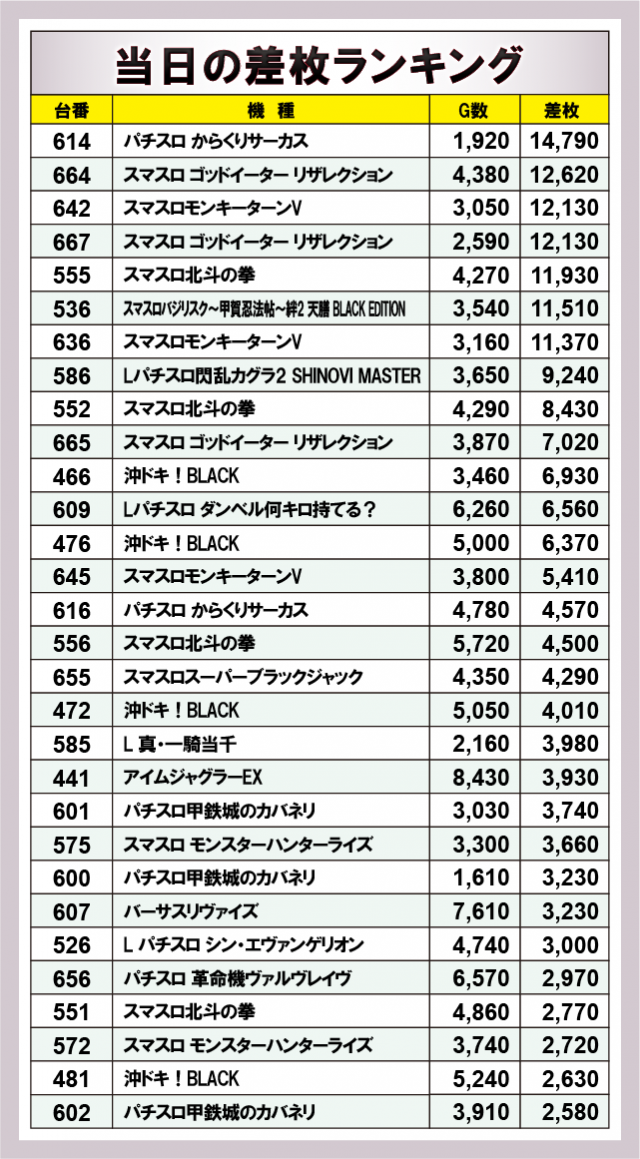 当日、特に盛り上がっていたのが上表の5機種。『スマスロ北斗の拳』『スマスロ ゴッドイーター リザレクション』『スマスロモンキーターンV』『パチスロ からくりサーカス』は万枚OVERを輩出しており、その盛り上がりぶりは他の島や機種にも伝播していったようだ。さらに『パチスロ甲鉄城のカバネリ』では3台設置全台がプラス差枚をマークするなど、同店の粋な計らいを感じ取ることができる。