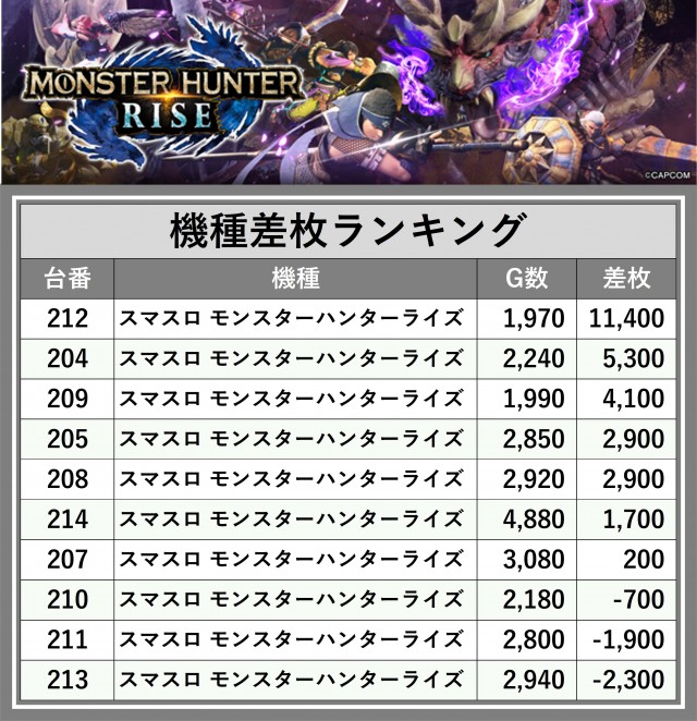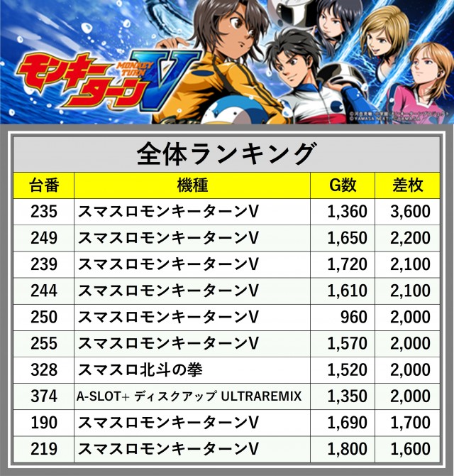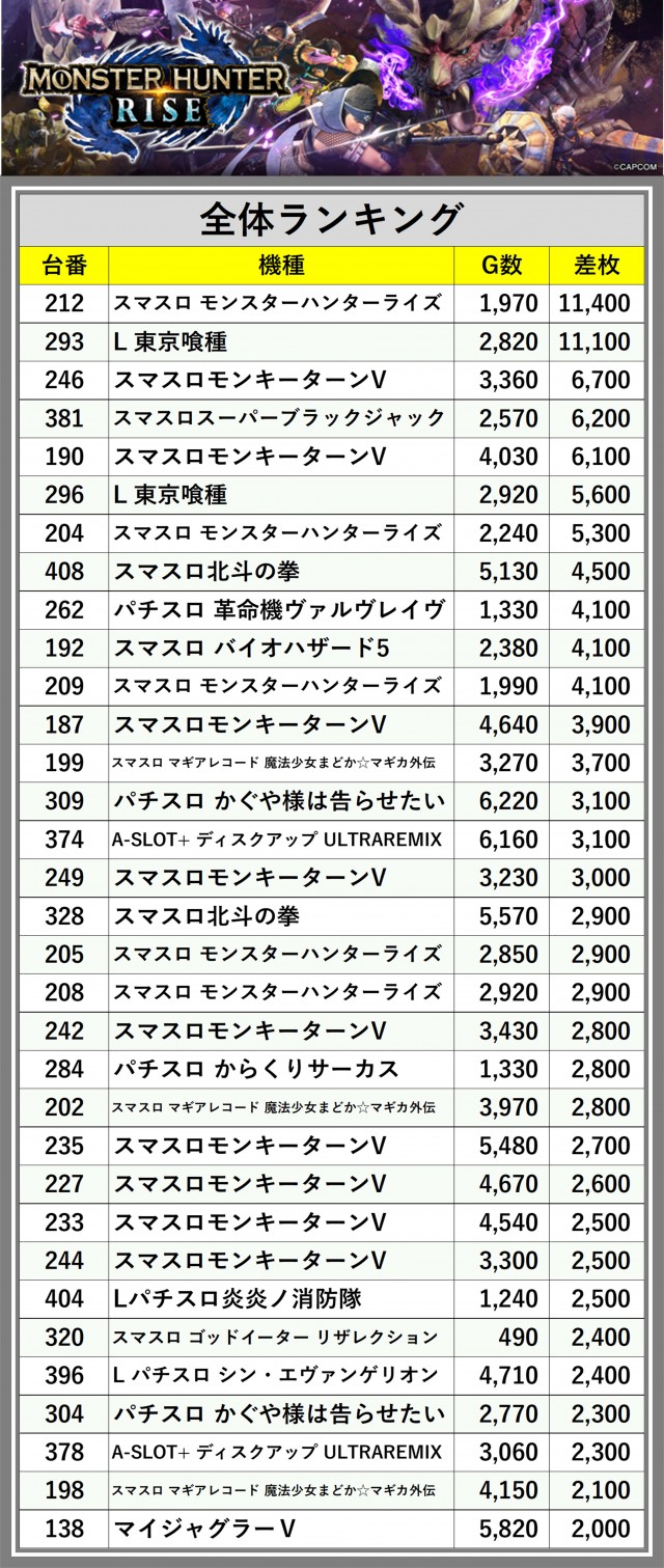 厳選された取材対象機種をはじめ、その他スロット全体から好記録が飛び出した!プレイヤーが楽しんだ1日を下記データにて振り返ってみて欲しい。