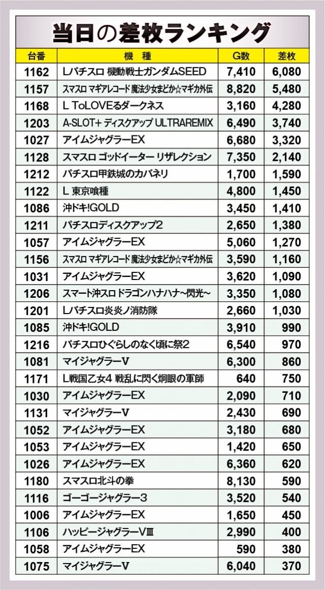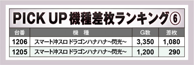 『スマスロ マギアレコード 魔法少女まどか☆マギカ外伝』は全台プラス差枚数を達成しており、終日を通して打ち込まれた結果、5,000枚OVERで大きく気を吐いていた。『スマート沖スロ ドラゴンハナハナ~閃光~』も同様に全台プラスで、優秀機種の高いポテンシャルが見て取れる。また各機種でまとまった出玉を確保しており、そこからも可能性を秘めていた事実が窺えるだろう。