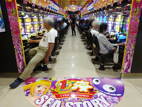 1円パチンコの支持も厚く、特に海物語シリーズが大人気。ほぼ満席となるほどにプレイヤーが集まっており、至る所で微笑ましいシーンを目撃。プレイヤーたちは満足気な様子だった。