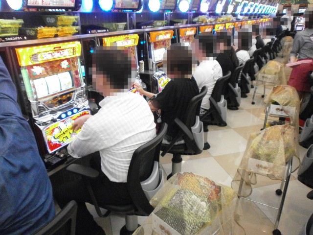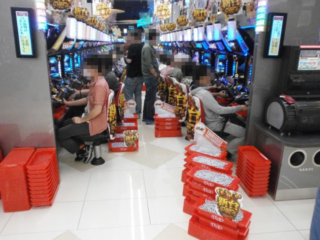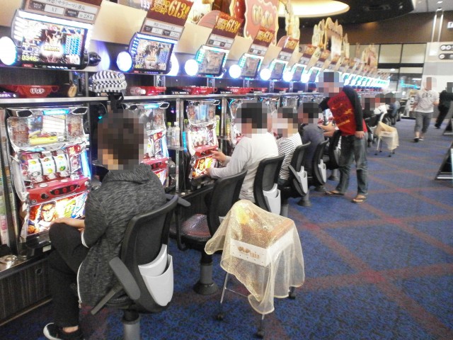 15時を過ぎたころの4円パチンコでは、朝イチからの勢いそのままに「CRぱちんこ必殺仕事人Ⅴ」が盛況。立ち見がでるほどにプレイヤーが集まっており、シマ全体は明るい雰囲気に包まれていた。