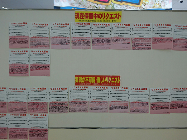 また、プレイヤーから届いた意見や要望がはられている掲示板を発見。たくさんの意見を取り入れたホールづくりをしようといった思いが感じられた。この思いは丁寧な接客にもしっかりとあらわれているようだ。
