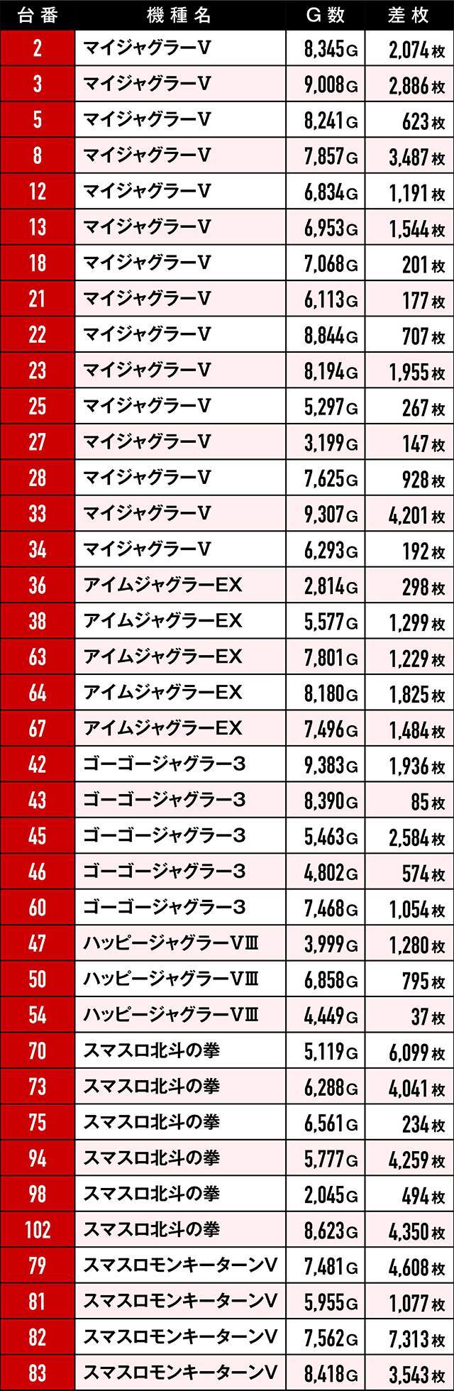 全てのプラス差枚の結果を集計したところ、とても偶然とは思えない偏りに気づいた。上記2つの差枚表の台番に注目してもらえば、その偏りに気づくことだろう。果たしてこれは偶然だったのか…?
