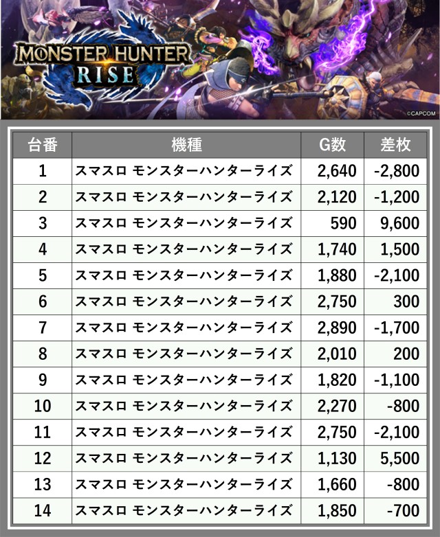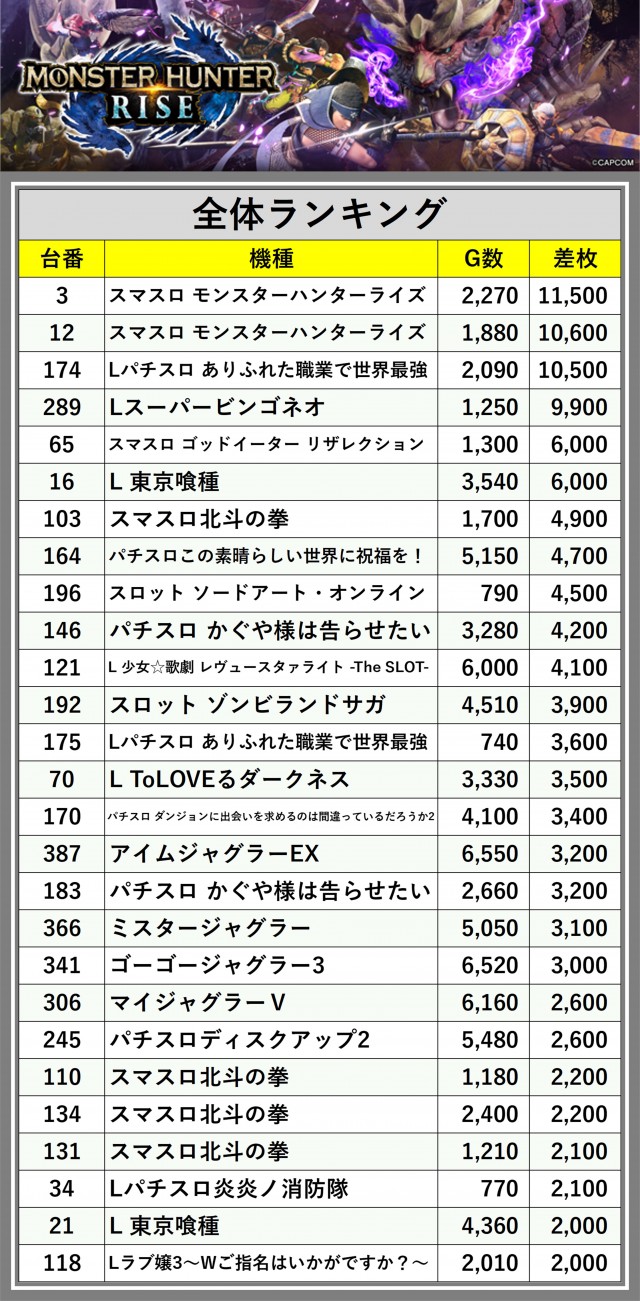 厳選された取材対象機種をはじめ、その他スロット全体から好記録が飛び出した!プレイヤーが楽しんだ1日を下記データにて振り返ってみて欲しい。