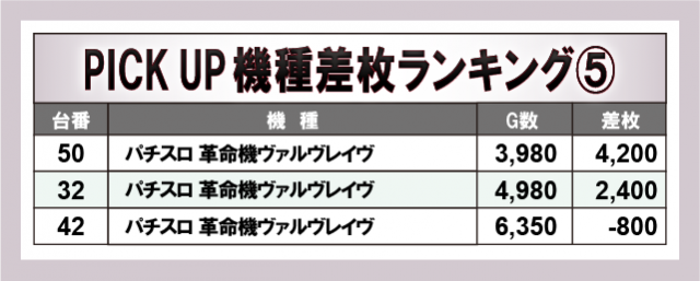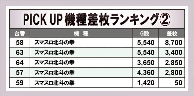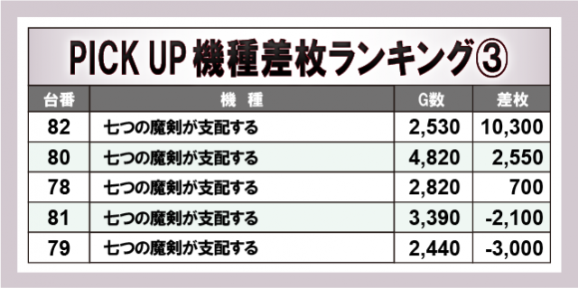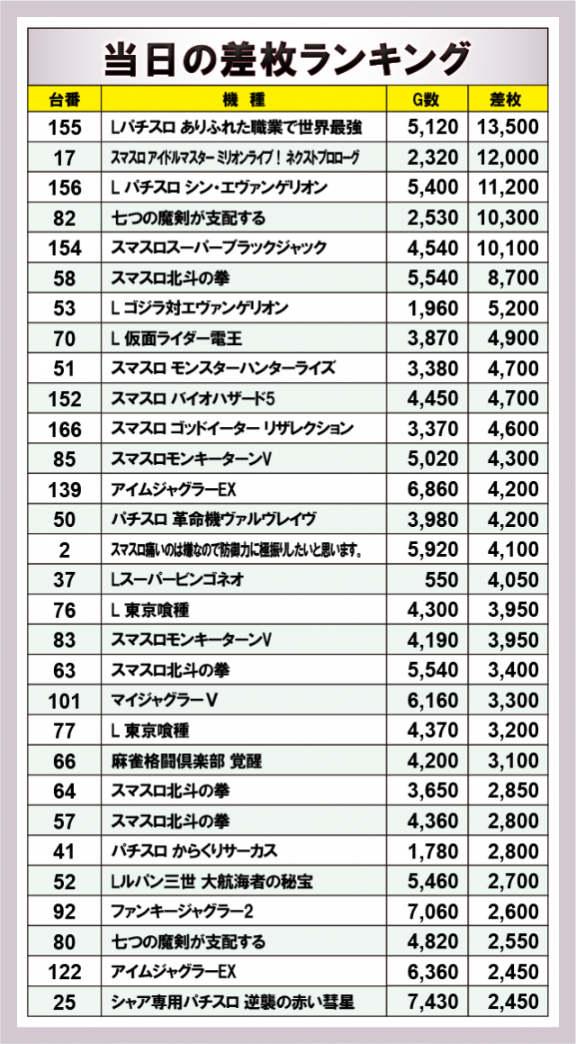今回優秀機種として名を挙げたのが上表の5機種。『アイムジャグラーEX』は4,000枚OVERを筆頭に4桁プラス台が多数発生し、ファンが自信をもってレバーを叩いていた様子が目に浮かぶ。またスマスロ機から『スマスロ北斗の拳』、『七つの魔剣が支配する』で圧巻のパフォーマンスを披露していた。さらに『スマスロモンキーターンV』『パチスロ 革命機ヴァルヴレイヴ』は設置3台中2台がプラスとしっかりと熱を帯びており、活気に満ちた状況だったことが窺える。