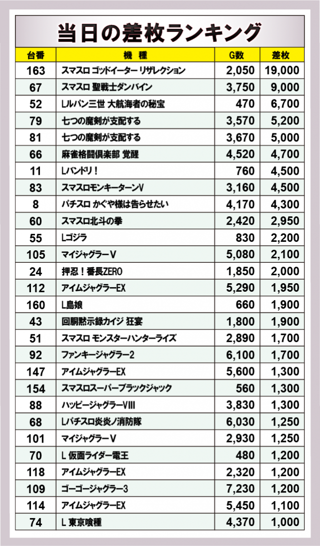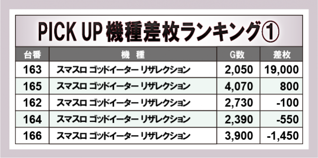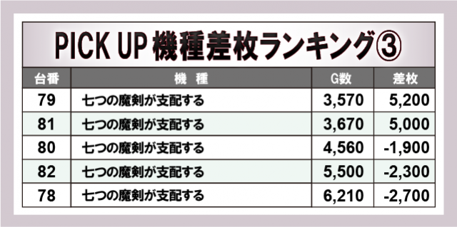 今回優秀機種として取り上げたのは上表の3機種。万枚OVERを達成した『スマスロ ゴッドイーター リザレクション』や2台の5,000枚OVERがうまれた『七つの魔剣が支配する』など、まとまった出玉を獲得し、その存在感を大いにアピールしていた。