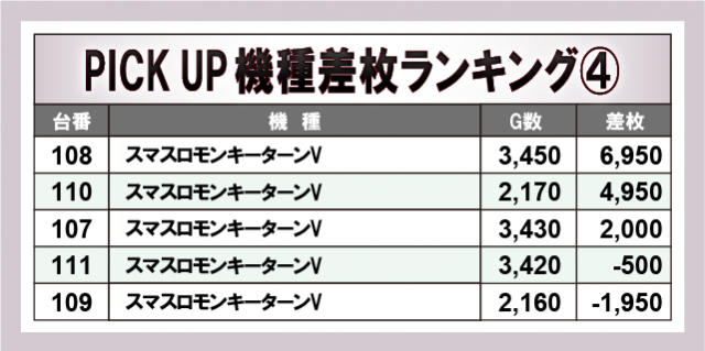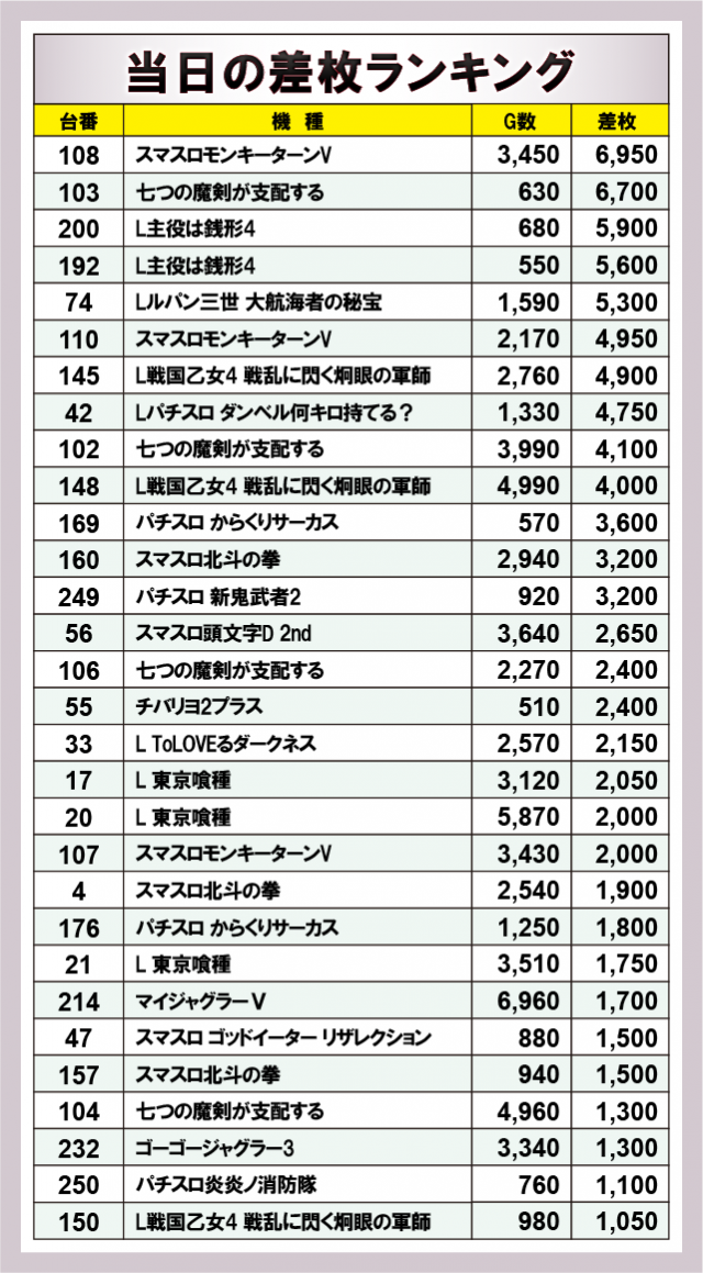 まずは当日の差枚ランキングを見てみよう。今回トップを飾ったのが『スマスロモンキーターンV』で+6,950枚をマーク!次点で『七つの魔剣が支配する』が+6,700枚を獲得し、店内の盛り上がりに大きく貢献していた。さらに『L主役は銭形4』『Lルパン三世 大航海者の秘宝』で5,000枚OVERがうまれるなど、スマスロ機を中心に大きな熱気に包まれていたのは確かだ。