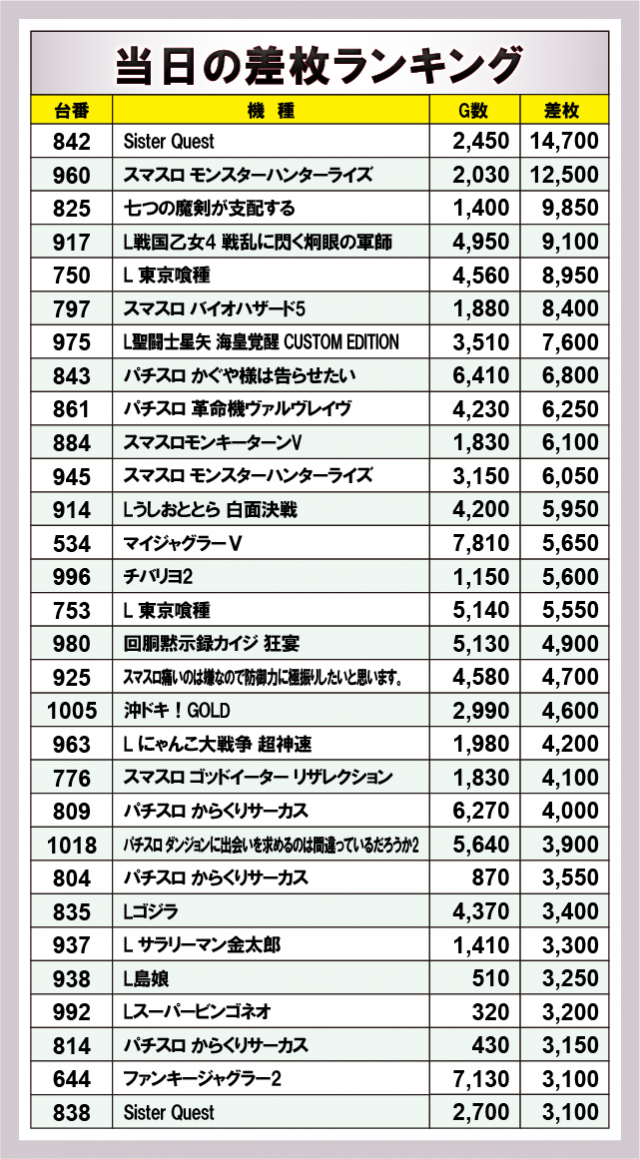 『Sister Quest』『スマスロ モンスターハンターライズ』から計2台の万枚OVERが発生!さらにTOP30台は3,000枚OVERからとなっており、スマスロ機を中心に随所で見どころのある展開が繰り広げられ、まとまった出玉を獲得する台が多発していた!